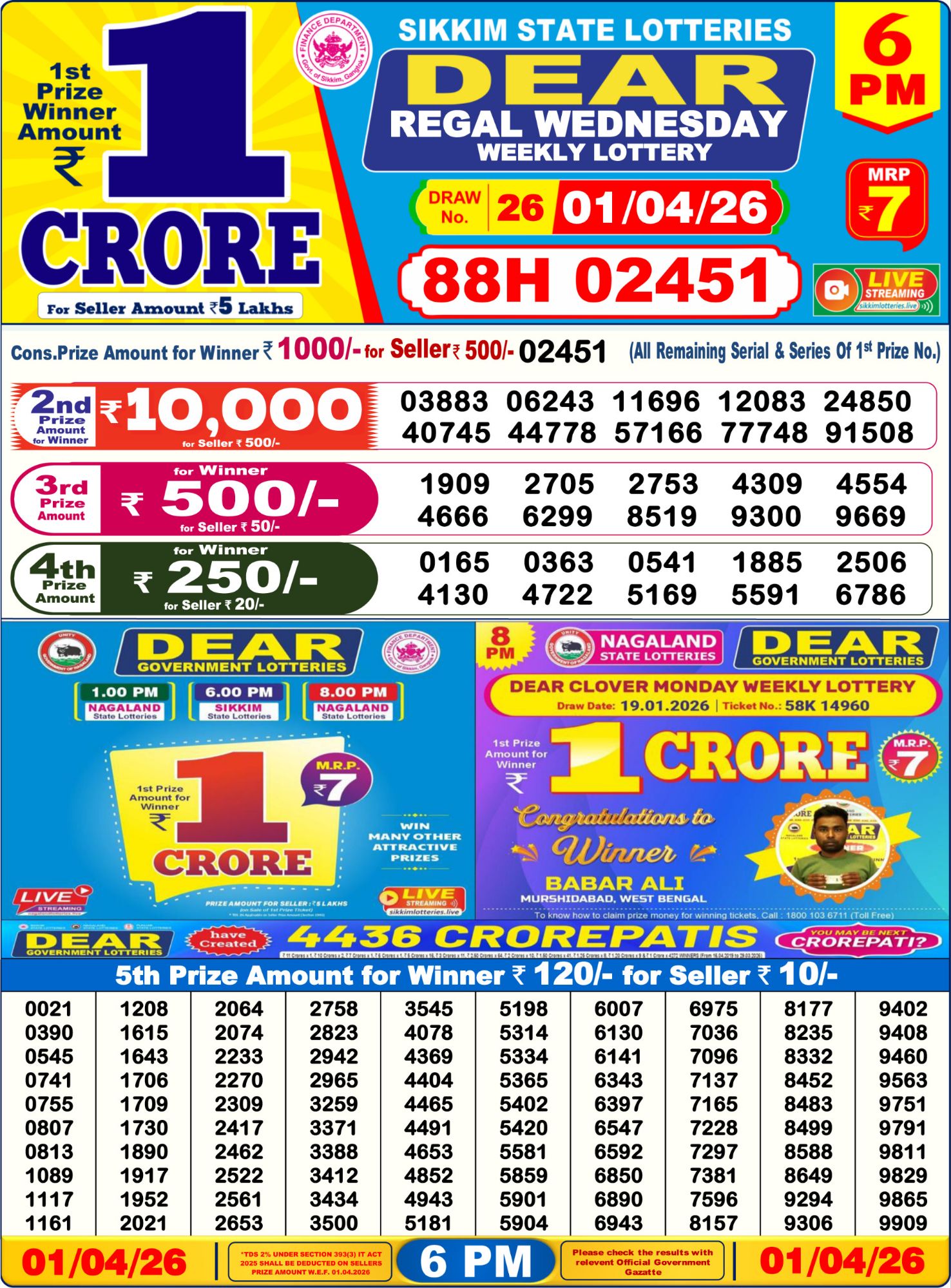 6PM Scheme is Dear Regal Wednesday Weekly Lottery Result 01/04/26 6:00 PM