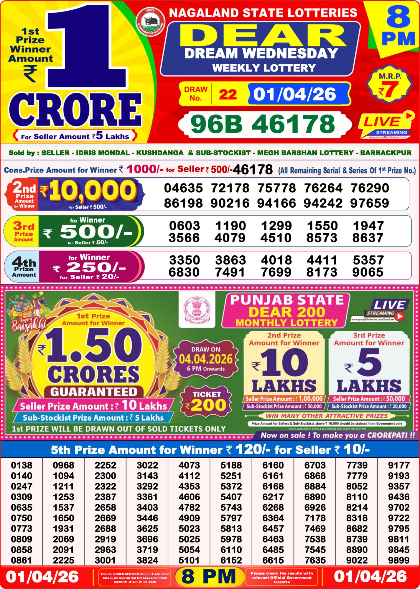 8PM Scheme is Dear Dream Wednesday Weekly Lottery Result 01/04/26 8:00 PM