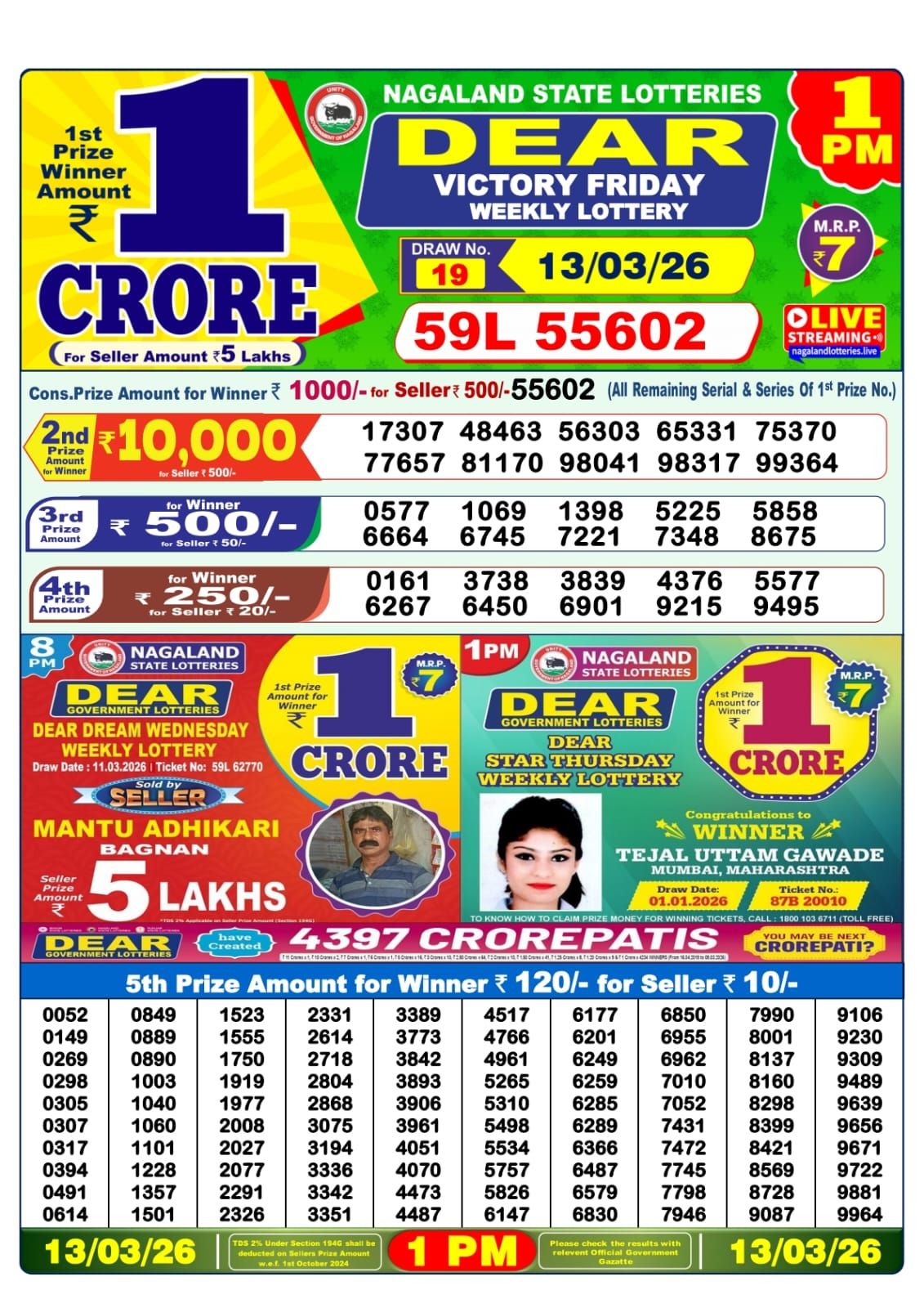 1PM Scheme is Dear Victory Friday Weekly Lottery Result 13/03/26 1:00 PM
